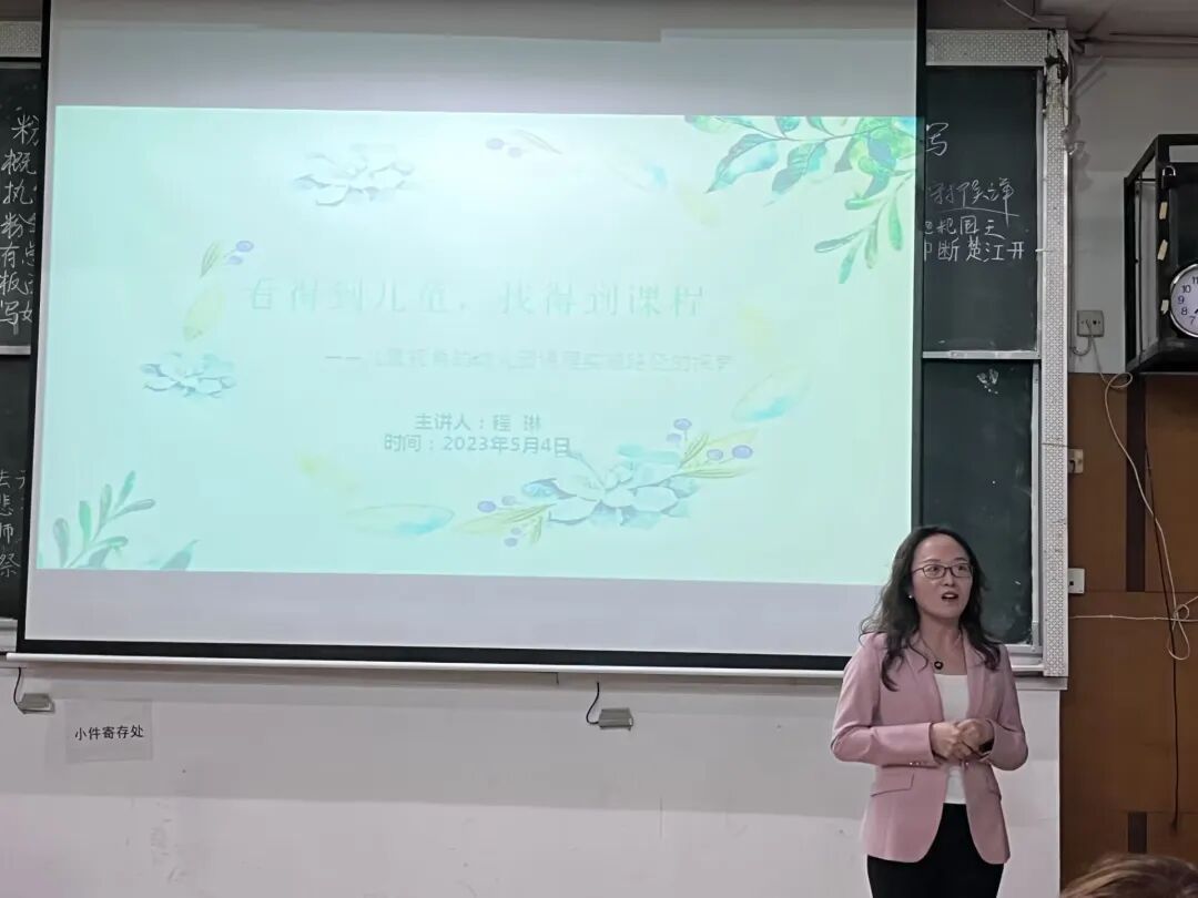 本次讲座的主题是“看得到儿童,找得到课程——儿童视角的幼儿园课程实施路径的探索”。程琳老师首先分享自己在大学的经历感受以及从事一线教师的教学经验,提到从儿童视角切入课程的方式对自己的实践工作非常有帮助,也更加认同教师这个职业。然后从“什么是幼儿园课程”“什么是儿童视角”两个方面引入本次主题,程琳老师通过详细的介绍,提升了同学们对幼师职业的了解,期间播放“35太难了”视频,从真实的角度近距离观察儿童,帮助大家更加了解儿童视角。接着,程琳老师给大家分享一本名为《儿童的100种语言》的书,并介绍近期春晓幼儿园开展的主题活动,提出教室应该是幼儿实践活动的场地,并表示遇到突发情况,同学们要发挥主人翁意识,要有责任感,有担当。最后,程琳老师总结此次讲座内容,再次强调从儿童视角开展课程的重要性,提倡同学们在未来从教中能够靠近儿童,贴近童心。