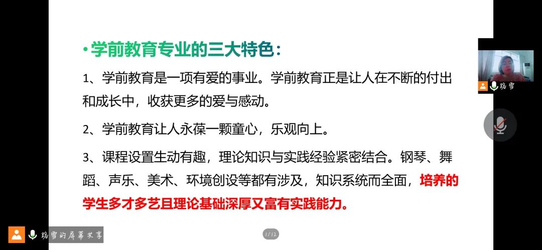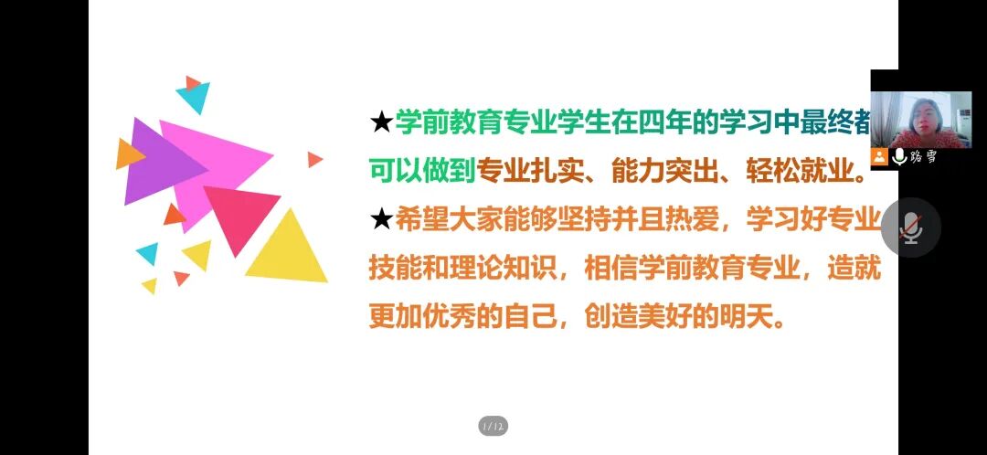 为促进教育学院22级学前教育专业新生了解学前教育专业中所学的课程、专业背景以及就业前景,帮助新生确定奋斗目标,我院于9月7日15:30通过腾讯会议召开2022年学前教育宣讲会。我院学前教育教研室主任路雪老师主讲,全体22级学前教育专业新生参加会议。