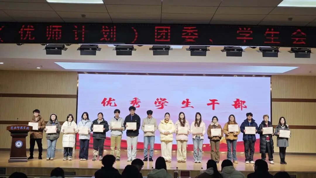 2026年1月9日晚,一多书院(优师计划)团委、学生会年终总结大会在北区一站式学生社区大学生活动中心正式召开。本次大会以“书院深耕优师志,团学实干践初心”为主题,系统回顾学年工作,表彰先进典型,并对未来发展作出展望。书院团委书记胡涵伊、辅导员曹钰涓,以及团委、学生会全体成员、主持队队员共同参会。会议由主持队张砚溪、李明悦同学主持。