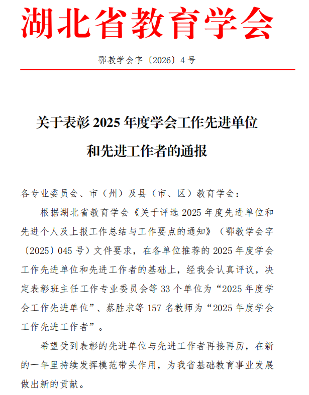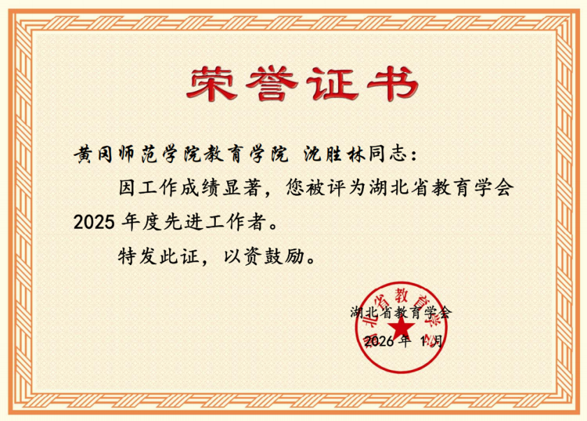 近日,根据鄂教学会字〔2025〕045 号文件的申报条件及评选要求,湖北省教育学会在省内各单位推荐上报的先进工作者材料基础上,经评议最终一共评选出157 名教师为2025年度先进工作者。其中,我院院长助理沈胜林博士获评湖北省教育学会2025年度“先进工作者”荣誉称号,进一步彰显了学院在教师发展方面的成绩。