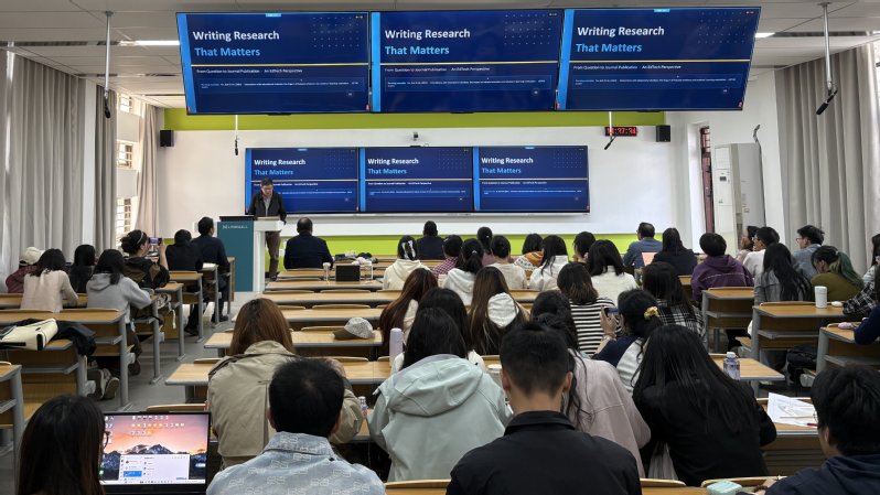 4月1日下午,Tiong-Thye Goh博士以“Writing Research That Matters——From Question to Journal Publication: An EdTech Perspective”为题,分享了教育技术视域下高水平期刊论文的写作与发表经验。他从研究问题的凝练出发,详细解析了引言、方法、结果、讨论等各个部分的写作要点,并强调了理论贡献与实践意义并重的原则。作为《Computers & Education》《Smart Learning Environments》等SSCI/SCI期刊的资深审稿人,Tiong-Thye Goh博士还就如何回应审稿意见、避免常见拒稿原因等给出了实用建议。报告现场互动热烈,师生们就研究设计、期刊选择等话题与Tiong-Thye Goh博士进行了深入交流。