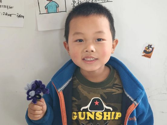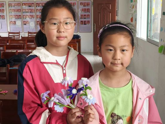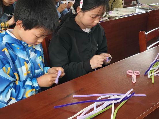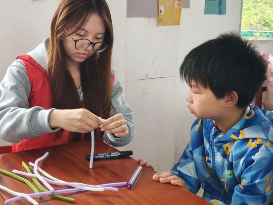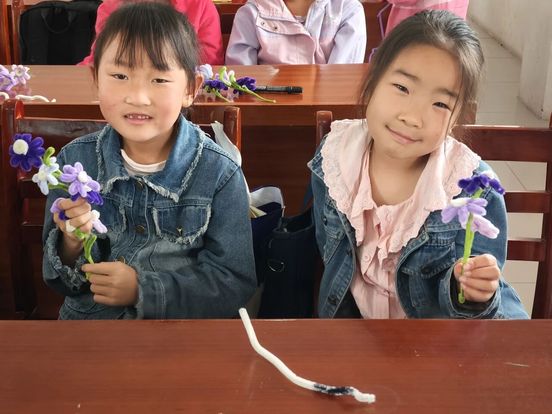 扭扭棒手工环节开始后,志愿者们一步步演示小花的制作方法,仔细讲解每一个步骤。孩子们听完讲解后积极尝试,遇到困难便主动求助,志愿者们俯身耐心指导,协助大家完成小花的制作。完成后,孩子们将自己制作的小花交到老师手中,由志愿者将零散的小花精心组合,扎成一束完整又鲜艳的花束。