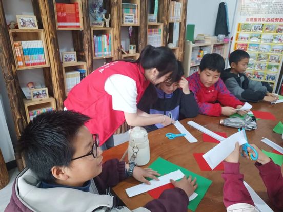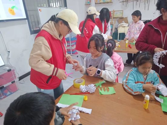 结束了对节日习俗与哲思的感悟,最受期待的手工环节开始了。志愿者们一步步示范,教孩子们用彩纸折出一朵朵素雅的纸花。折叠、裁剪、展开……一双双小手认真而专注,一朵朵纸花在指尖悄然绽放。这些美丽的花朵,承载着孩子们对先人的敬意与追思,也在他们心底种下了珍视生命、感恩当下的种子。